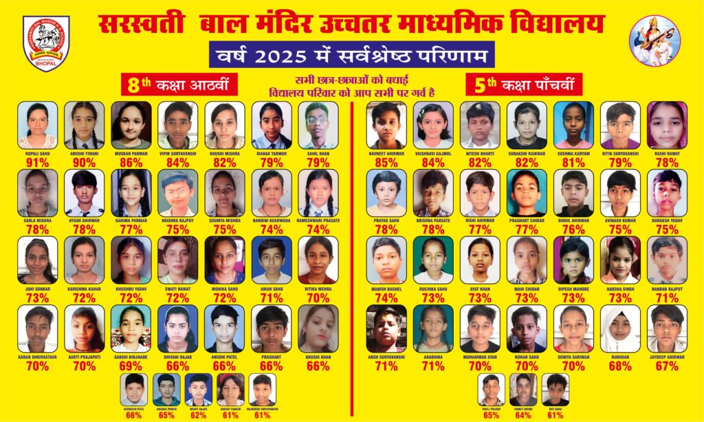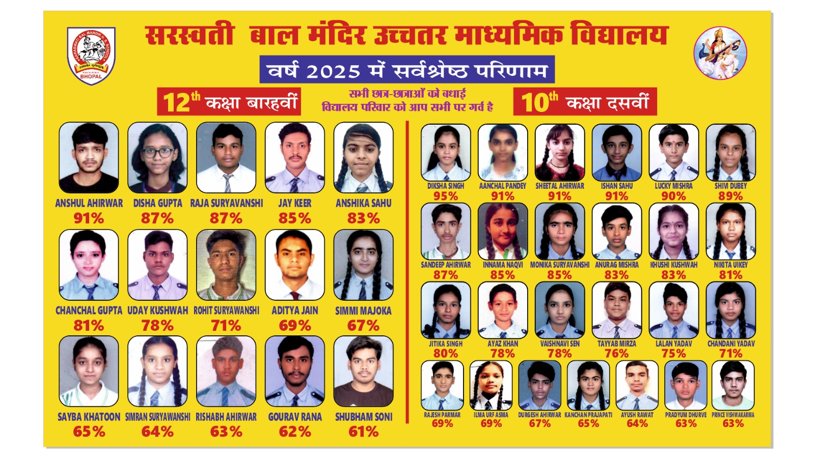 At Saraswati Bal Mandir Higher Secondary School, we take immense pride in our students’ remarkable academic achievements year after year. Our consistent 100% board exam results and high distinction rates reflect the hard work of our students, the dedication of our teachers, and the supportive learning environment we nurture. From Class X to Class XII, our students not only clear exams with flying colors but also secure top positions at the district and state levels. These results stand as a testament to our commitment to excellence in education and the holistic development of every learner.